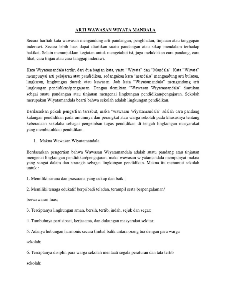 Arti Wawasan Wiyata Mandala : Artikel : Berdasarkan pengertian bahwa wawasan wiyatamandala adalah suatu pandang atau tinjauan mengenai lingkungan pendidikan/pengajaran, .. Wawasan adalah suatu pandangan atau sikap yang mendalam terhadap suatu hakikat. Sehingga wawasan wiyata mandala dapat . Arti dan makna wawasan wiyata mandala wawasan : Arti dan makna wawasan wiyata mandala. Wawasan wiyata mandala adalah konsepsi atau cara pandang bahwa sekolah merupakan lingkungan atau kawasan penyelenggaraan pendidikan.